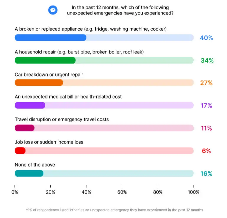 More than four in five (84%) people experienced at least one unexpected emergency in the past 12 months, ranging from household repairs to sudden medical or travel costs.
