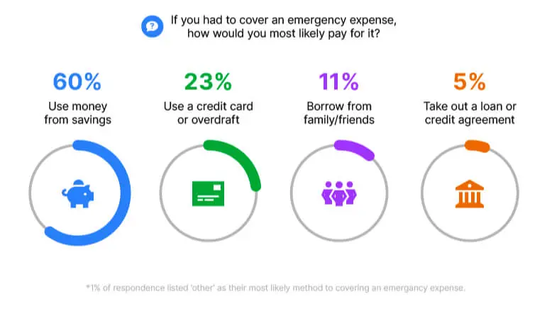 Six in 10 (60%) UK adults say they would use savings to pay for an emergency, making it the most common way to handle unexpected costs.
