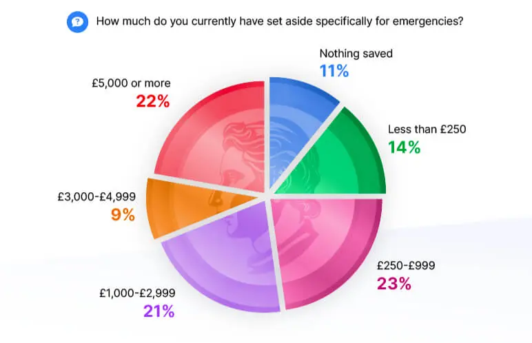 At the other end of the scale, 22% have £5,000 or more saved, while around one in five people (21%) fall into the mid-range with between £1,000 and £2,999 set aside for emergencies.